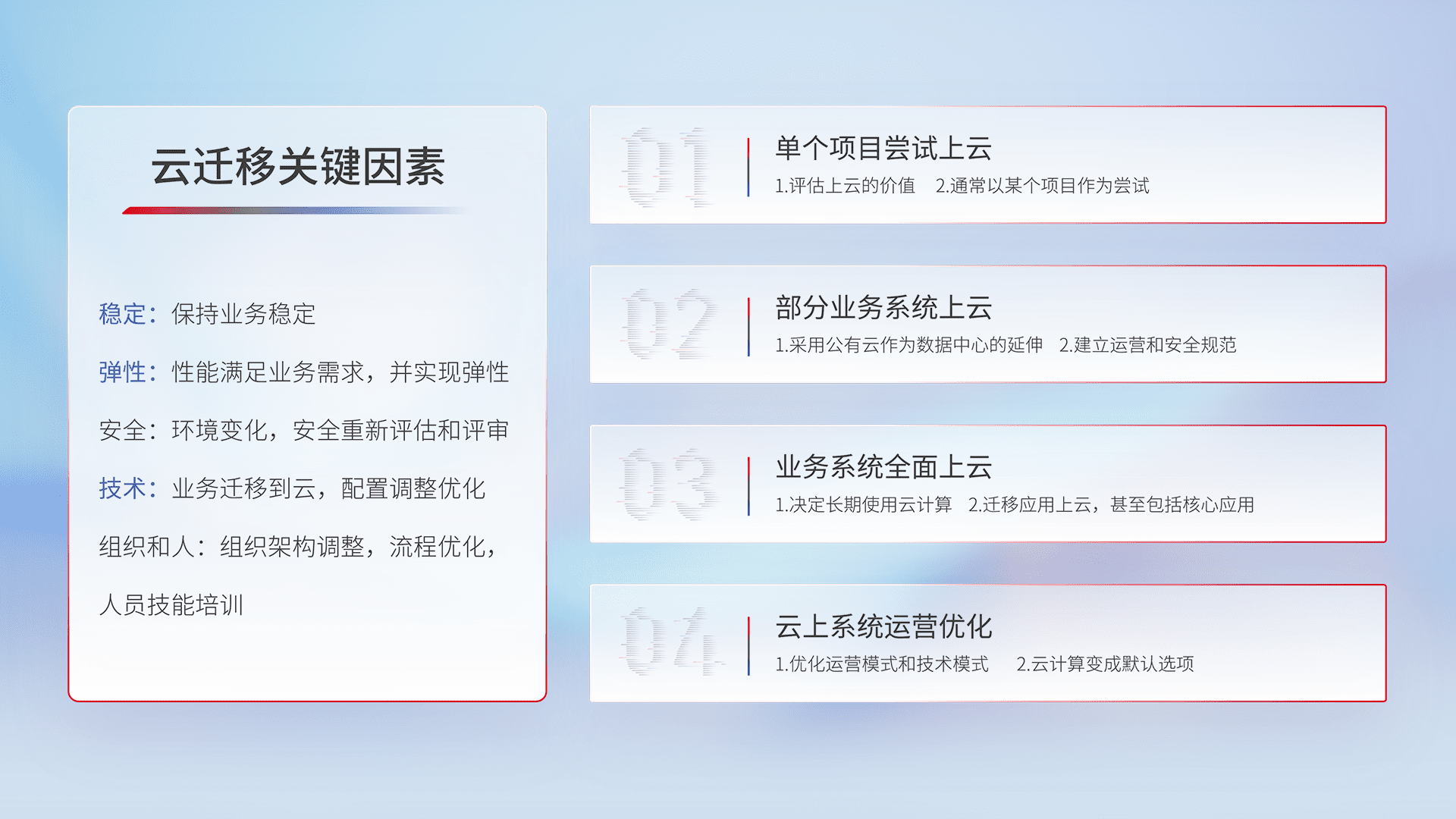 结合实际业务,,,从规划设计、、、云平台选型、、云原生改造、、、数据迁移、、集成交付,,,迁移全过程为客户识别最佳上云路径,,做好风险识别管理,,设计网络架构、、身份权限、、安全审计合规、、操作审计、、、、日志审计、、监控告警策略、、多站点容灾设计等,,,对云上基础设施进行整体规划,,,,提升IT治理水平,,以满足弹性、、高可用、、、高性能的需求。。。