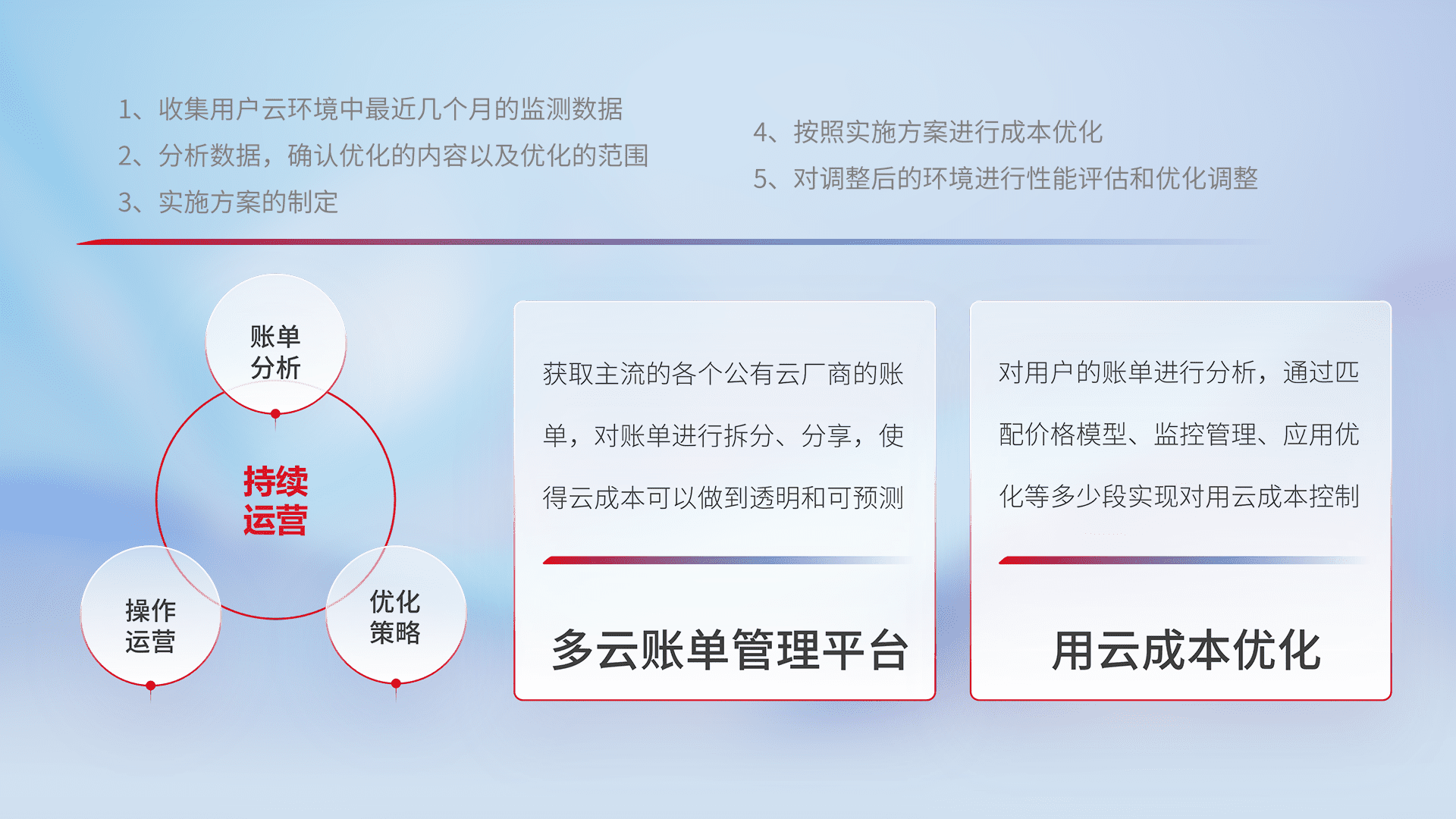 通过多云纳管,,,,以统一的资源数据模型把客户的云资源进行抽象和封装,,,,进而实现对多云资源的统一操作,,,,保障云资源管理的可靠性、、稳定性与可用性。。。量身定制化运维内容,,,,配置、、、、开发运维、、、补丁管理、、备份、、监控、、、、认证和访问管理、、、审计和日常巡检等,,,,保障在用云过程中的可靠度,,,稳定度以及高可用率。。。