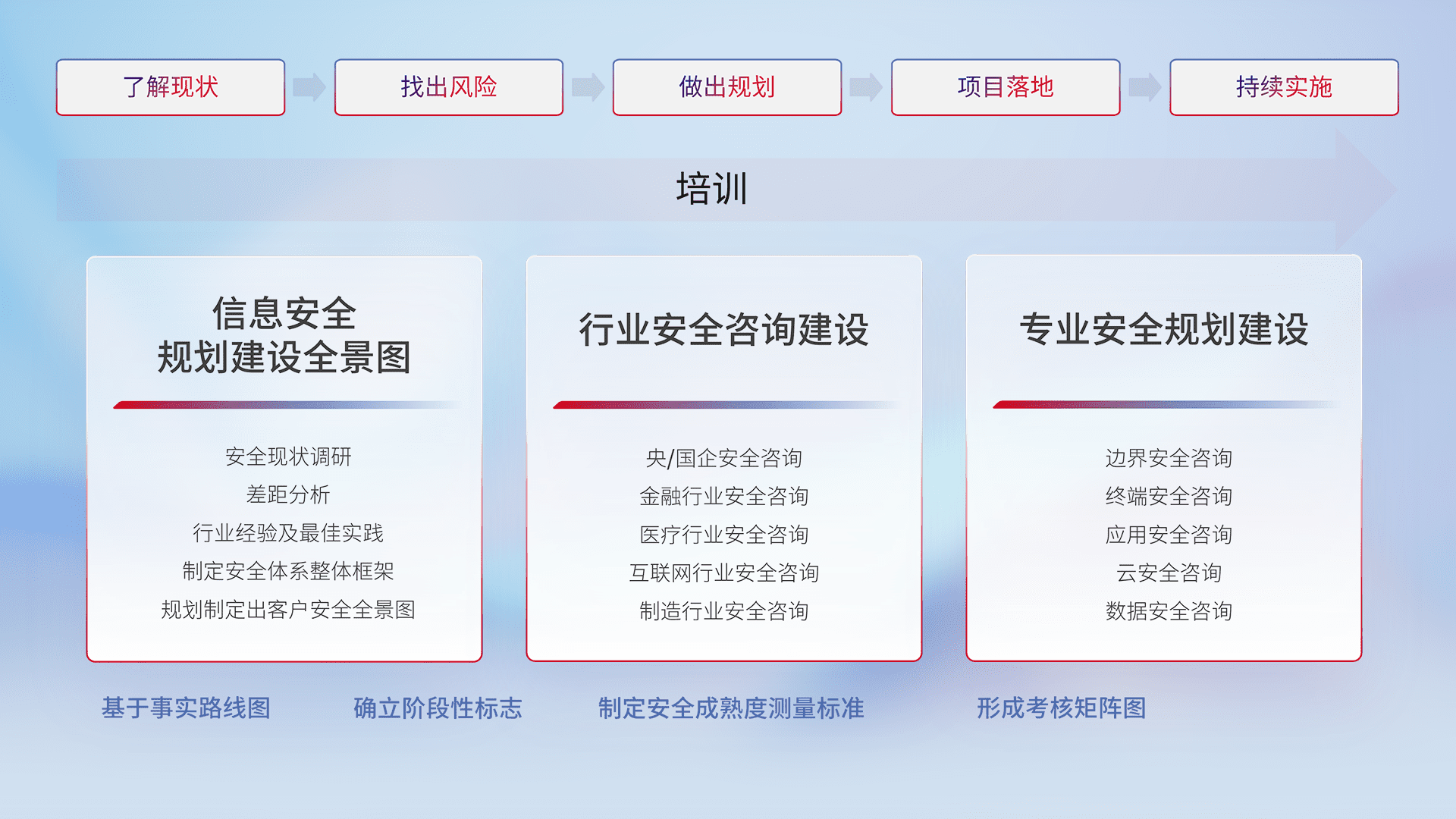 通过专业的法律咨询解读、、合规架构体现、、差异化解决方案、、测试实施支持等服务,,为客户量身打造等保合规体系。。